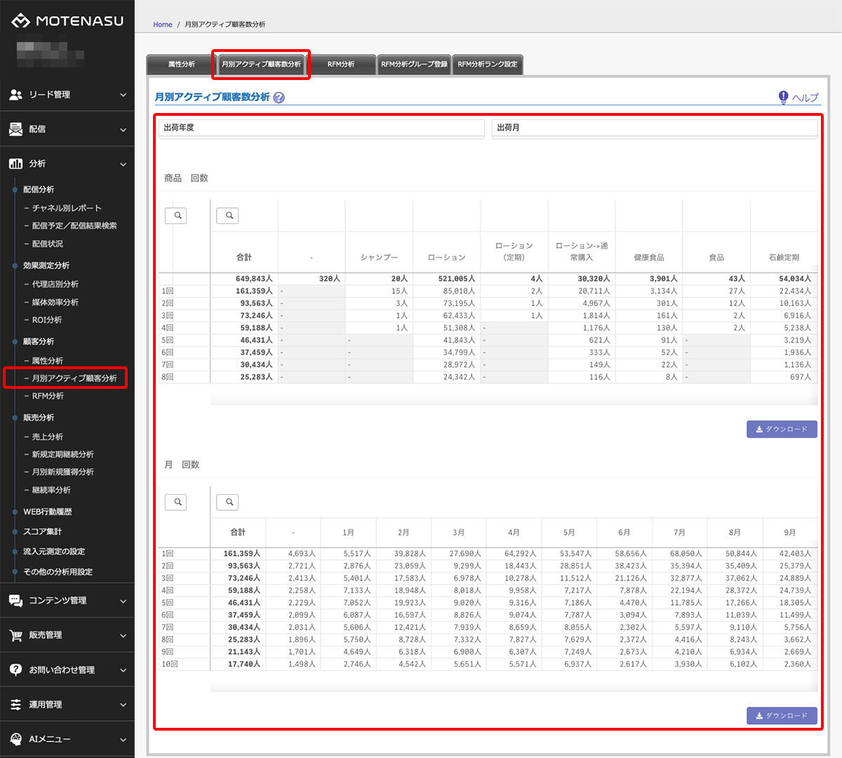 商品カテゴリごとの購入回数別顧客数一覧と、出荷月ごとの購入回数別顧客数一覧が確認できます。