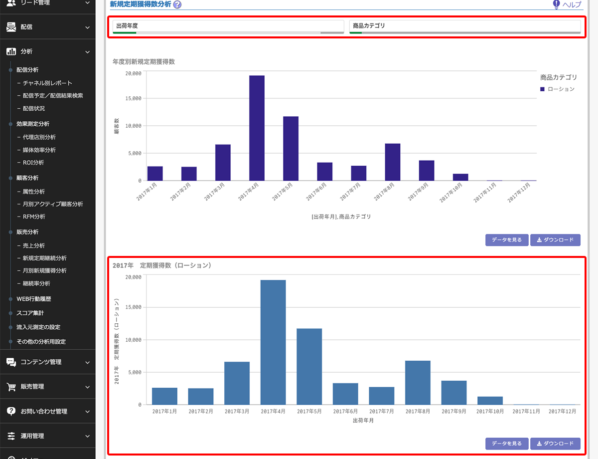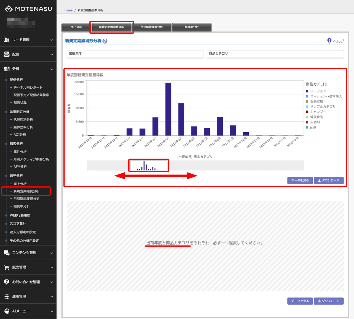新規定期獲得数分析 ▼新規定期獲得数分析 出荷年度、商品カテゴリごとの新規の定期購入者数を棒グラフで確認できます。 商品データの商品カテゴリが未設定の場合は分析できませんのでご注意ください。 受注データが長期間にわたる場合は、一部分を表示します。 グラフに下にある範囲表示スクロールバーで位置を調整します。 出荷年度を絞り込むと、スクロールバーは表示されなくなります。 出荷年度と商品カテゴリを絞り込むと、指定した年度の月ごとの新規定期購入者数のグラフが画面下段に表示されます。このとき上段のグラフも範囲に応じて変化します。