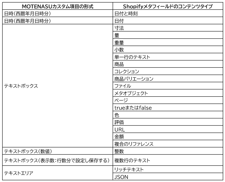 ①メタフィールドの命名規則があるため、必ずMOTENASUで項目を作成してから、Shopify側でメタフィールドを登録してください。先にShopifyで登録してあるメタフィールドをMOTENASUに連携することはできません。