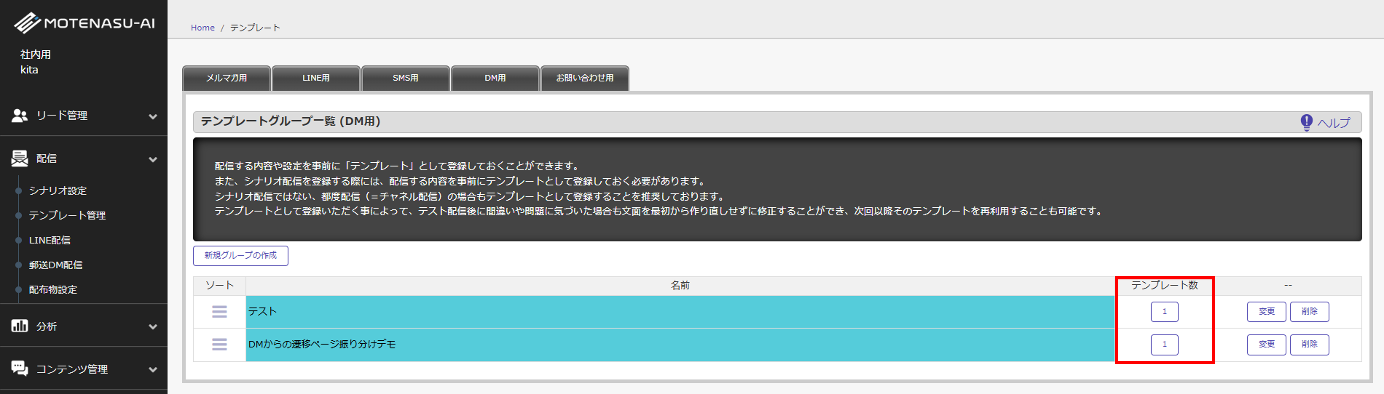 テンプレート名一覧が表示されますので、使用したいテンプレート名をクリックするとテンプレートの内容が「DMタイプ」「DMファイル」「リダイレクトタイプ」「優先度」「アクセス時変更ステージ」欄に反映されます。