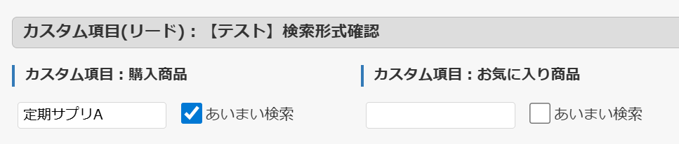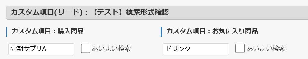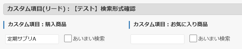 カスタム項目で「定期サプリA」「ドリンク」を記入し、「定期サプリA」のみあいまい検索に✓を入れる場合、下記のような結果が抽出されます。