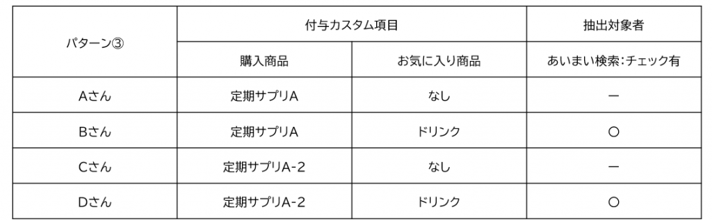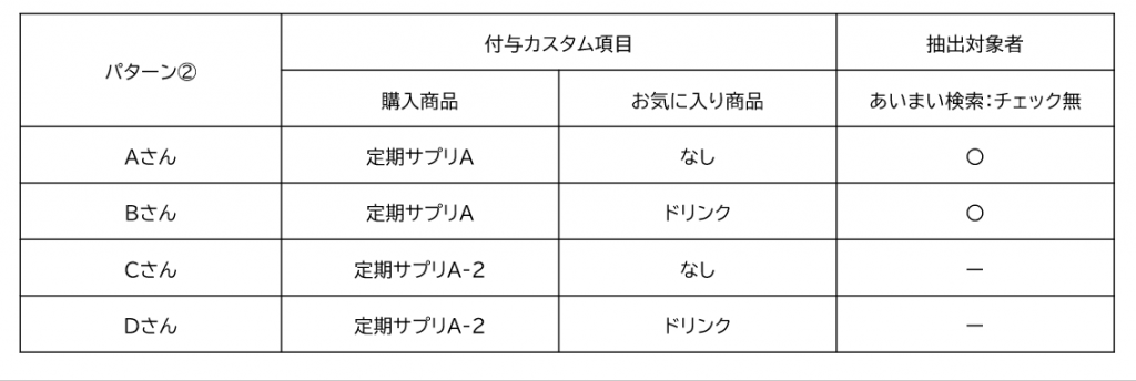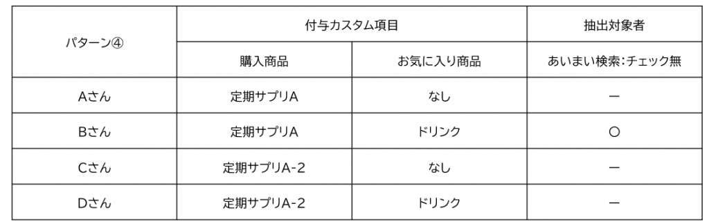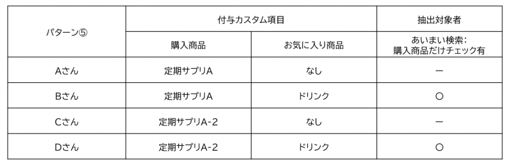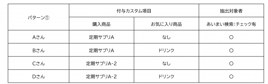 この場合、Aさん~Dさんの4名が検索対象として抽出されます。Cさん・Dさんの購入商品の名称は「定期サプリA-2」ですが、この名称に「定期サプリA」という文言が含まれているため、「あいまい検索」で抽出されます。