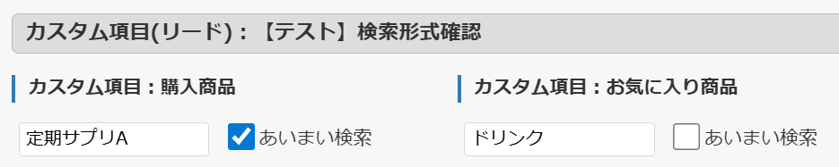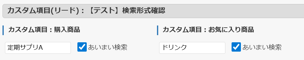 カスタム項目で「定期サプリA」「ドリンク」を記入し、あいまい検索に✓を入れる場合、下記のような結果が抽出されます。