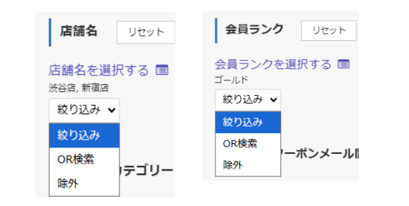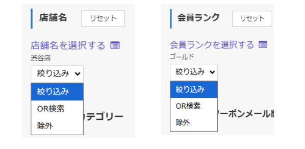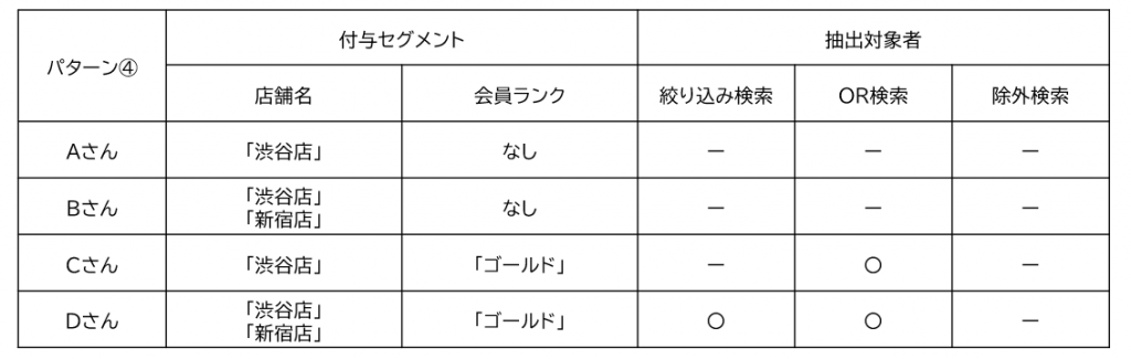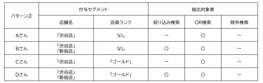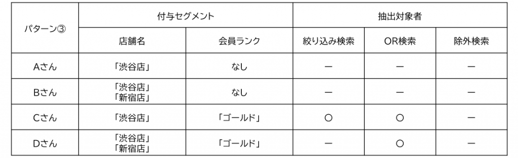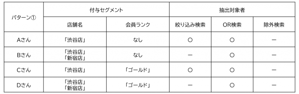 上記の通り「絞り込み」「OR検索」「除外」の3通りの検索をかけることができます。「渋谷店」「新宿店」「ゴールド会員」を例にとって、どのような結果が抽出されるかをご説明します。