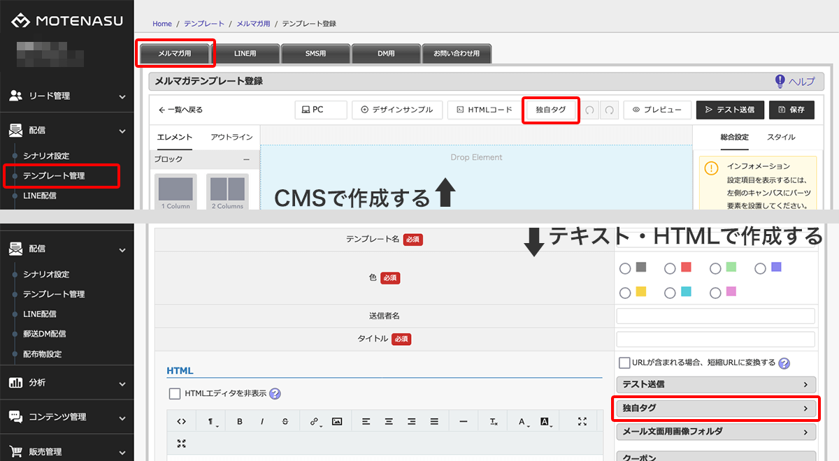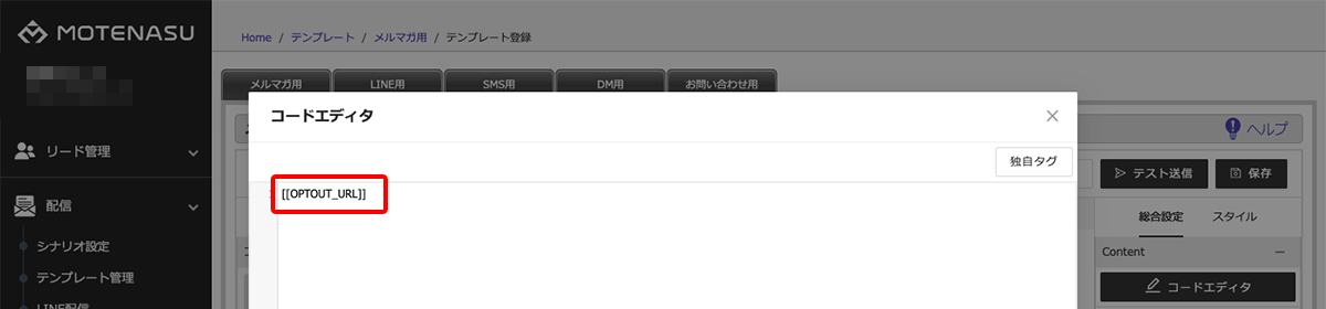 シナリオメールやメルマガ作成画面で[独自タグ]をクリック、「基本情報タグ」の[配信登録・解除URL]をクリックしてコピー、文面に貼り付けることで「配信解除URL」を設置することができます。