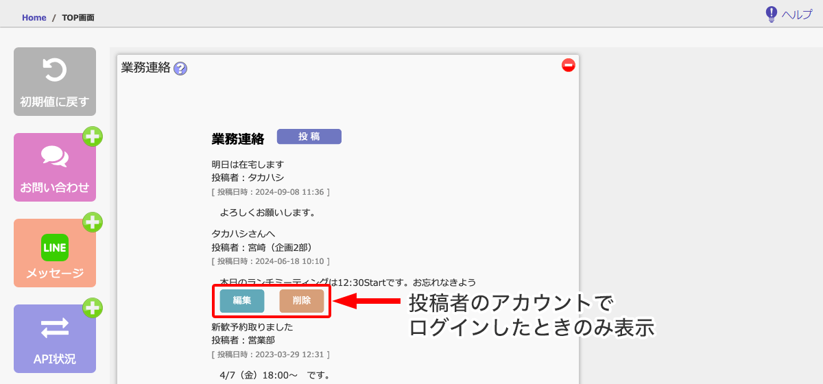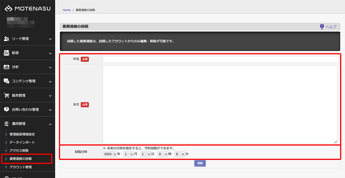 業務連絡の投稿 ▼業務連絡の投稿 運用管理 > 業務連絡の投稿 MOTENASU管理画面TOPに表示する「業務連絡」を投稿することができます。 htmlタグを使用できます。 投稿日時の設定で予約投稿が可能です。 投稿した業務連絡の編集・削除は、投稿したアカウントからのみ可能です。