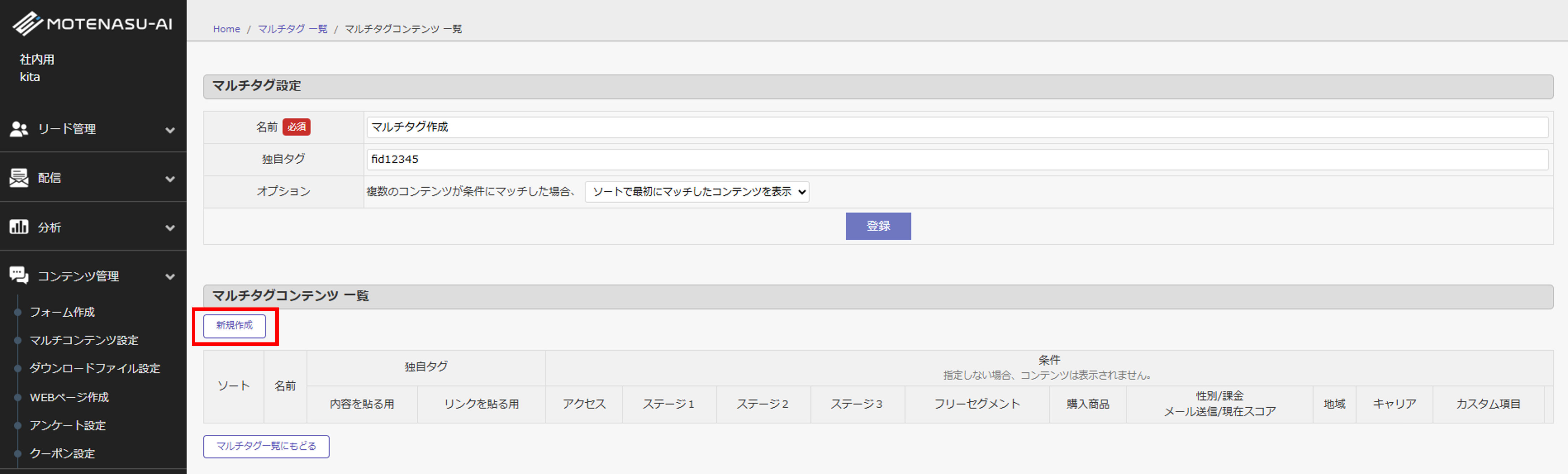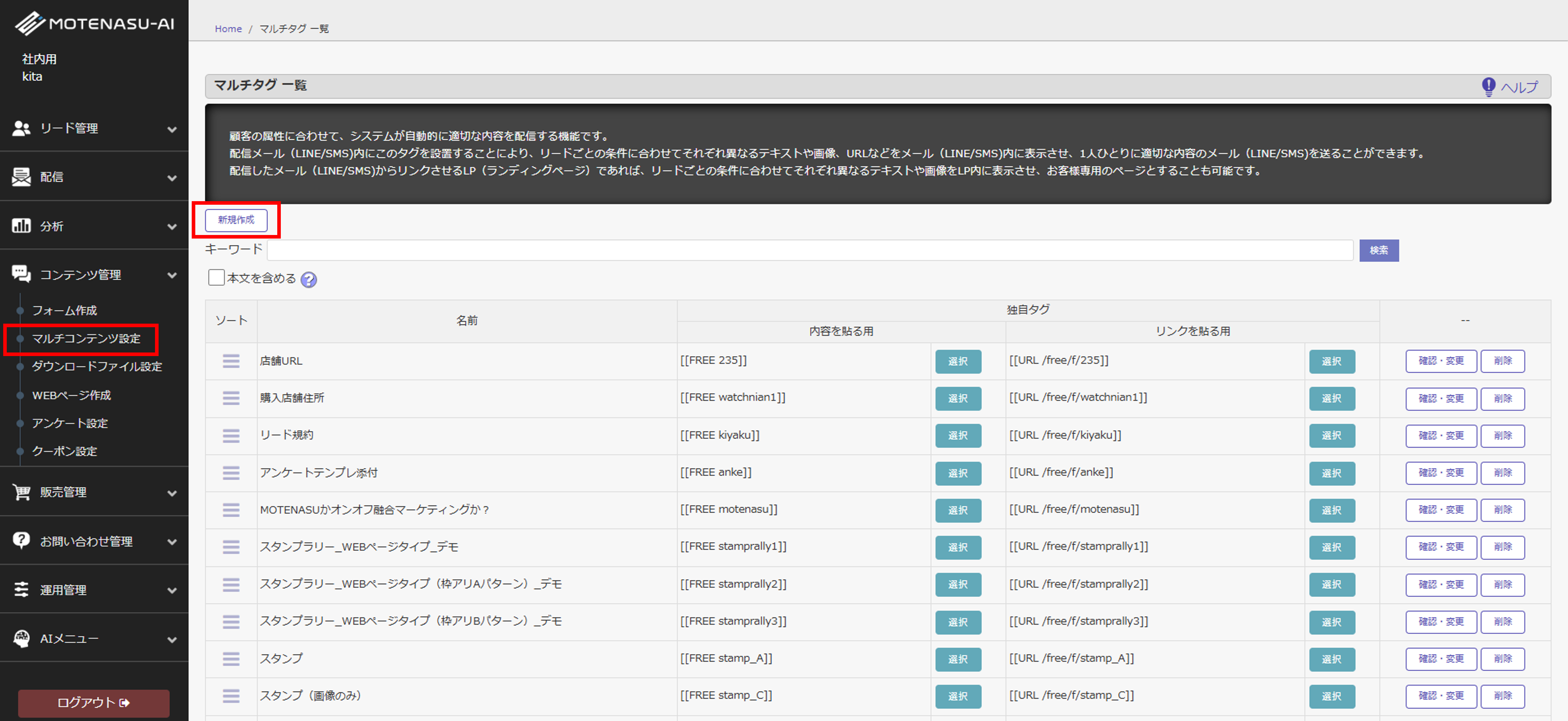 マルチタグを作成したあとは、お客様に表示するコンテンツである「マルチタグコンテンツ」を登録します。まずは[新規作成]をクリックします。