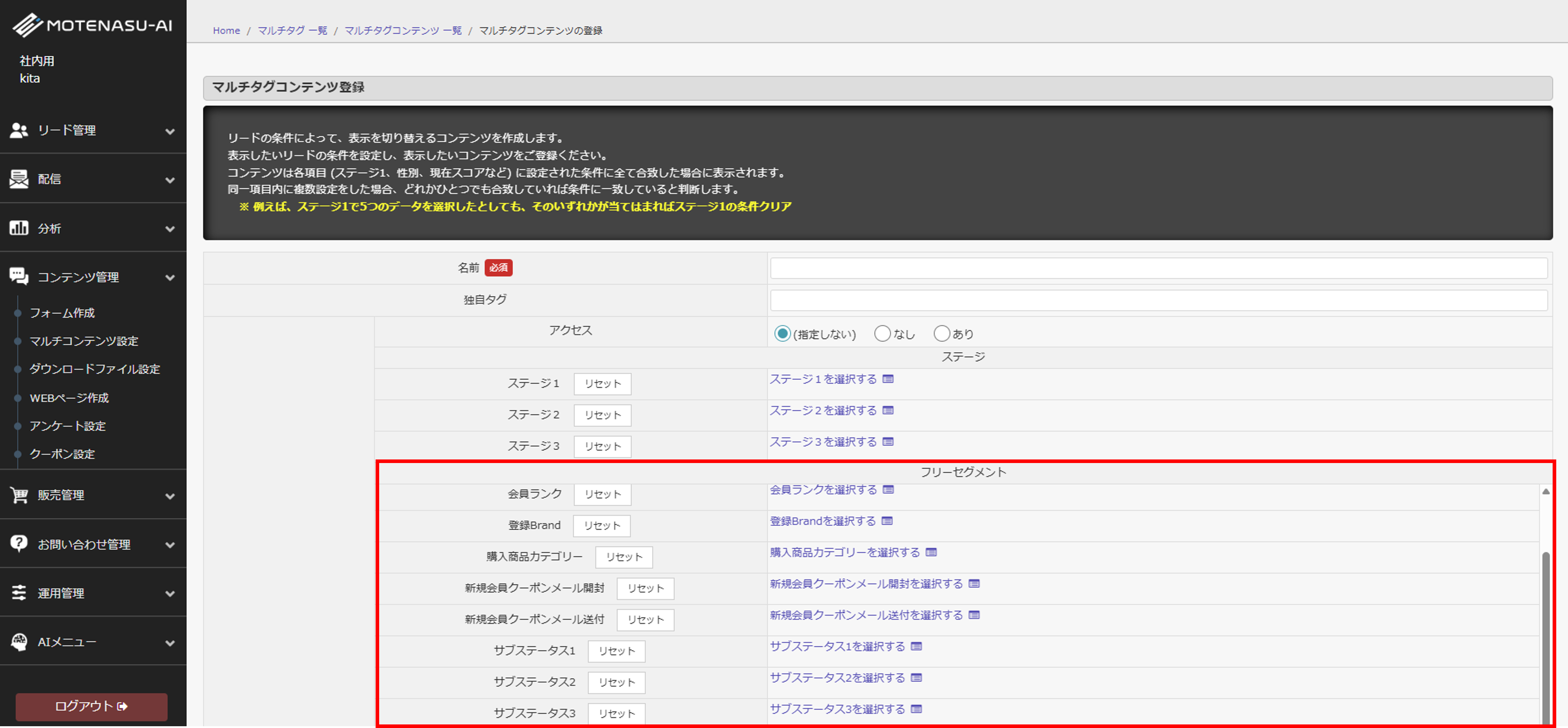 フリーセグメント(=セグメント):リード情報に付与される属性です。詳しくはCSVデータの作成方法(セグメント・カスタム項目)をご参照ください。