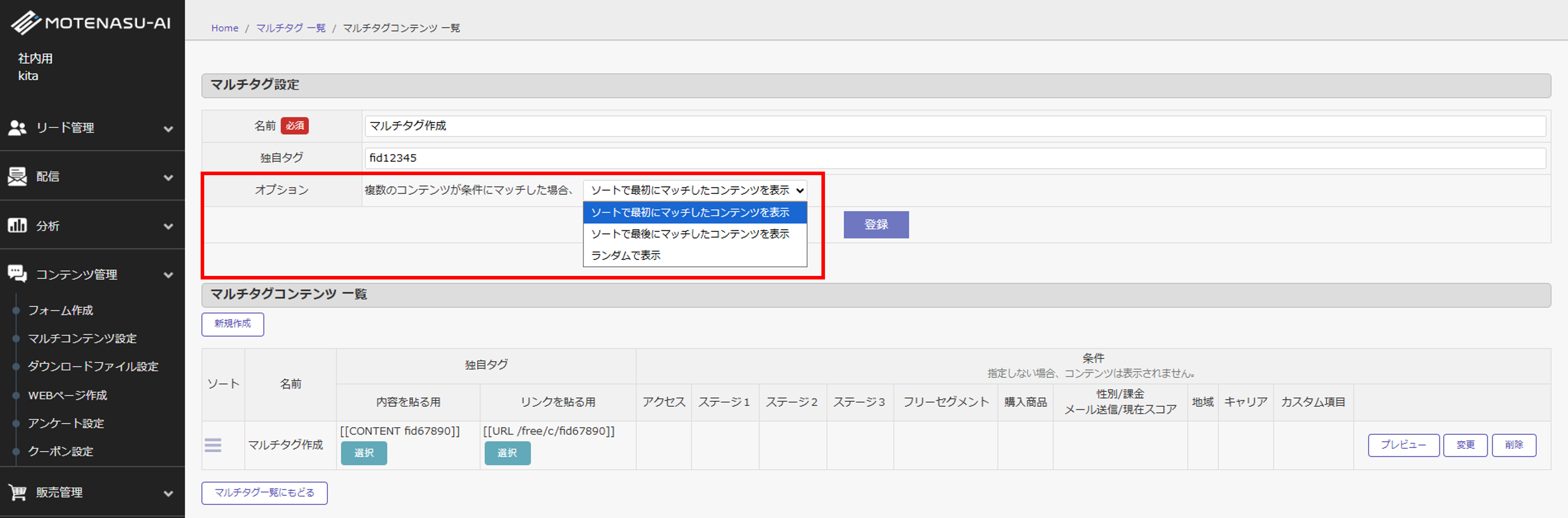 絞り込み条件の設定方法次第で、1人のリードが複数のマルチタグコンテンツの条件に一致することもあります。この場合、どの「マルチタグコンテンツ」を表示させるかを指定します。