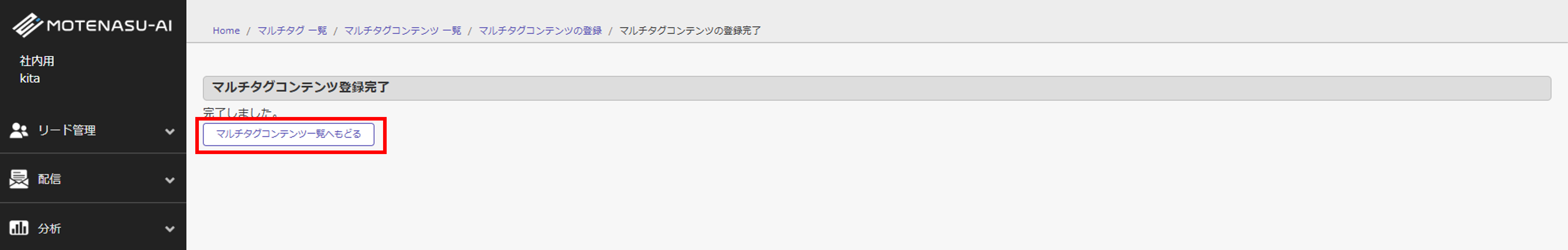 [登録]ボタンをクリックして登録完了画面が表示されたら、[マルチタグコンテンツ一覧へ戻る]ボタンをクリックします。
