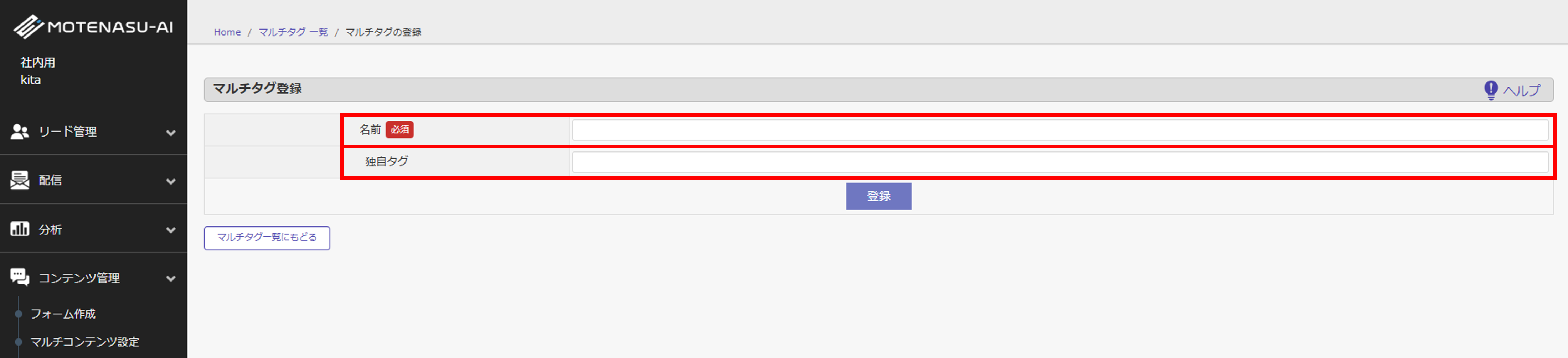 [登録]ボタンをクリックします。登録が完了すると、そのタグの中に入れる「マルチタグコンテンツ」の作成画面に遷移します。