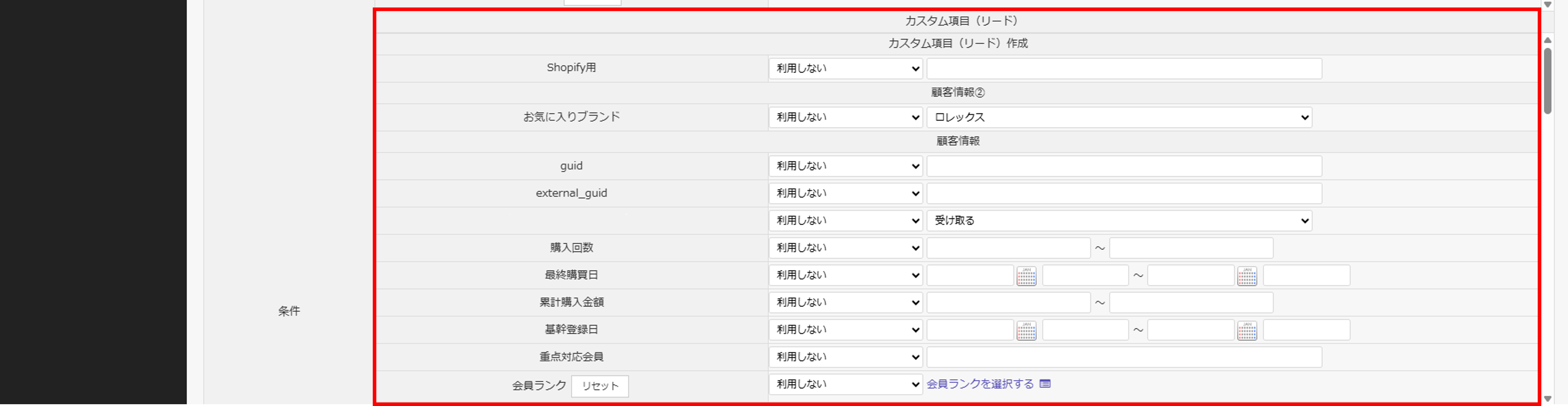 使用しない:そのカスタム項目を検索条件として使用しません。デフォルトは利用しないでセットされています。