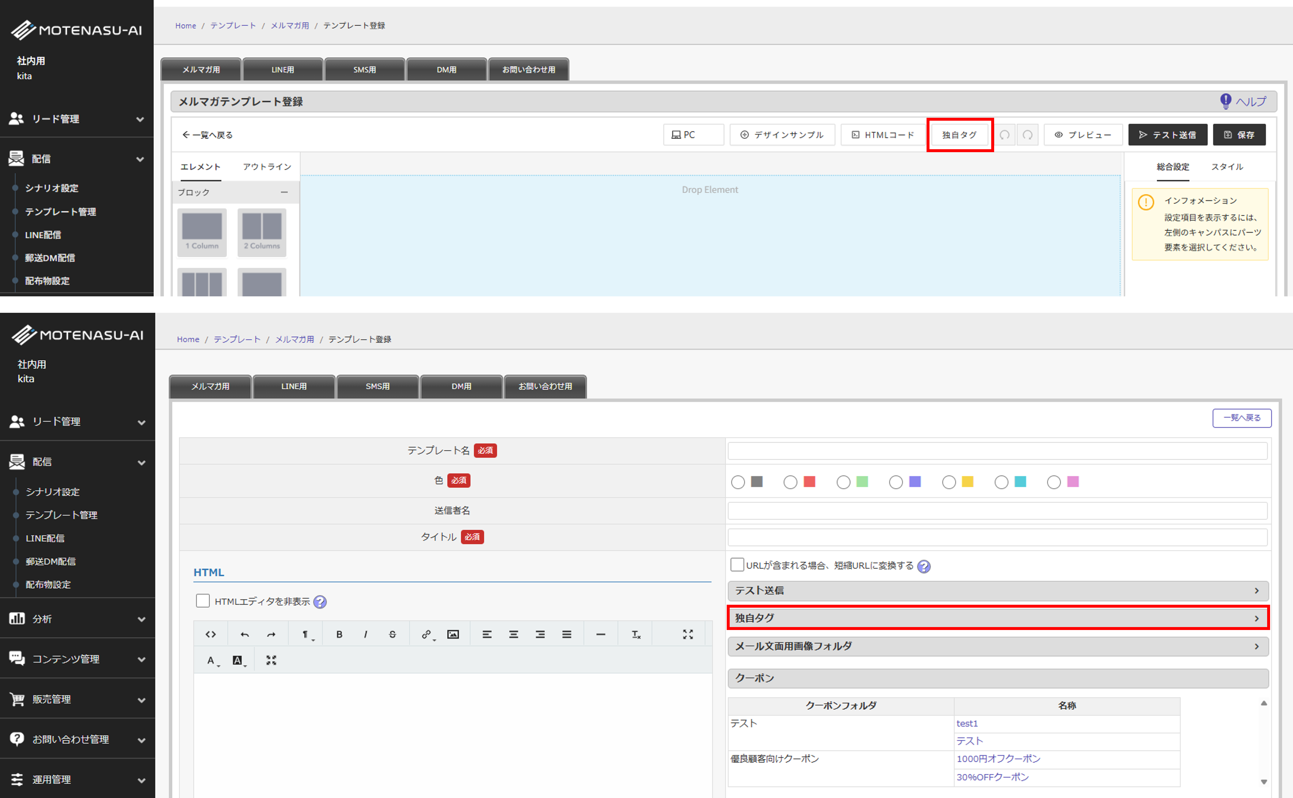 作成したマルチタグはMOTENASUから配信するメルマガ・LINE・SMS・郵送DMに設置して使用します。