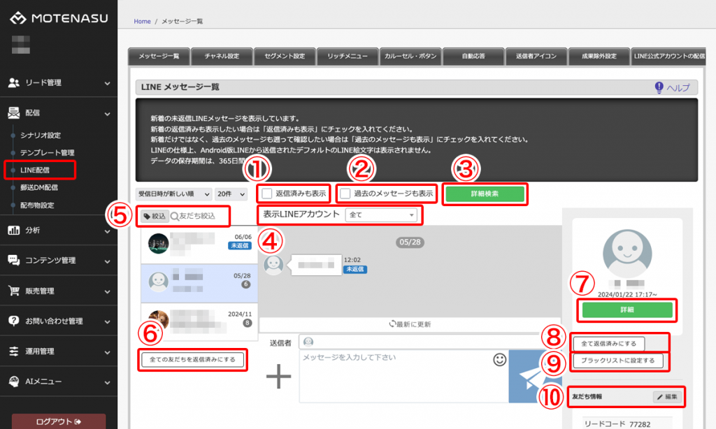 MOTENASUはリード検索して配信対象者を指定せずとも、メッセージ一覧画面からLINE配信をすることが可能です。メッセージ一覧画面では新着のLINEメッセージを表示します。
