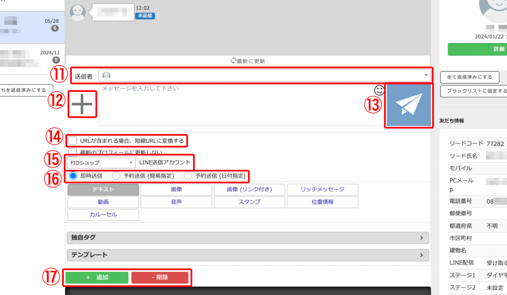 詳細検索や友だち絞り込みを行いLINE配信者を決定した後は、配信したいテキストや送信アカウントなどを入力します。入力後は⑬の紙飛行機マークをクリックすることでLINE配信が完了します。