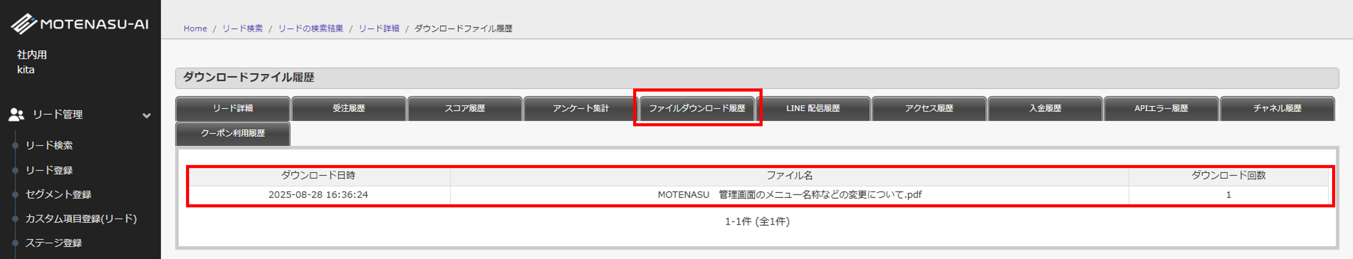 リード詳細で「ファイルダウンロード履歴」を開くと、そのリードが いつ/どのファイルを/何回/ダウンロードしたか確認することができます。