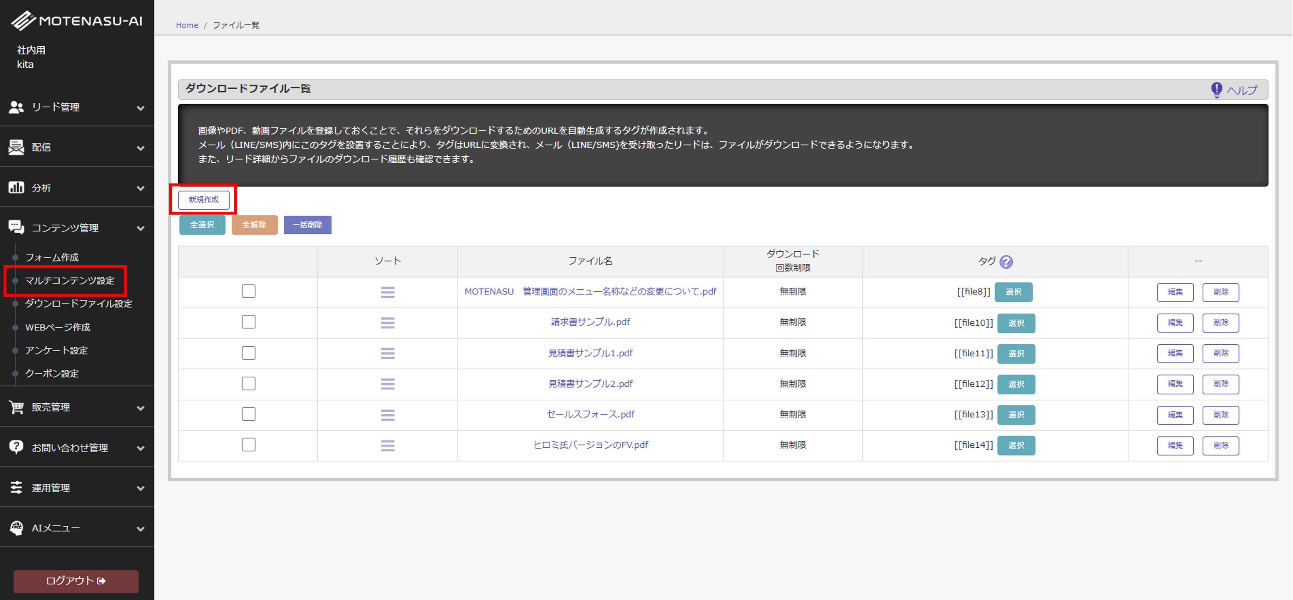 ダウンロードファイル機能とは、貴社がご用意したファイルをMOTENASUにアップロードし、それをお客様がダウンロードできるようになる仕組みです。登録できるファイルは、画像・PDF・動画の3種類になります。