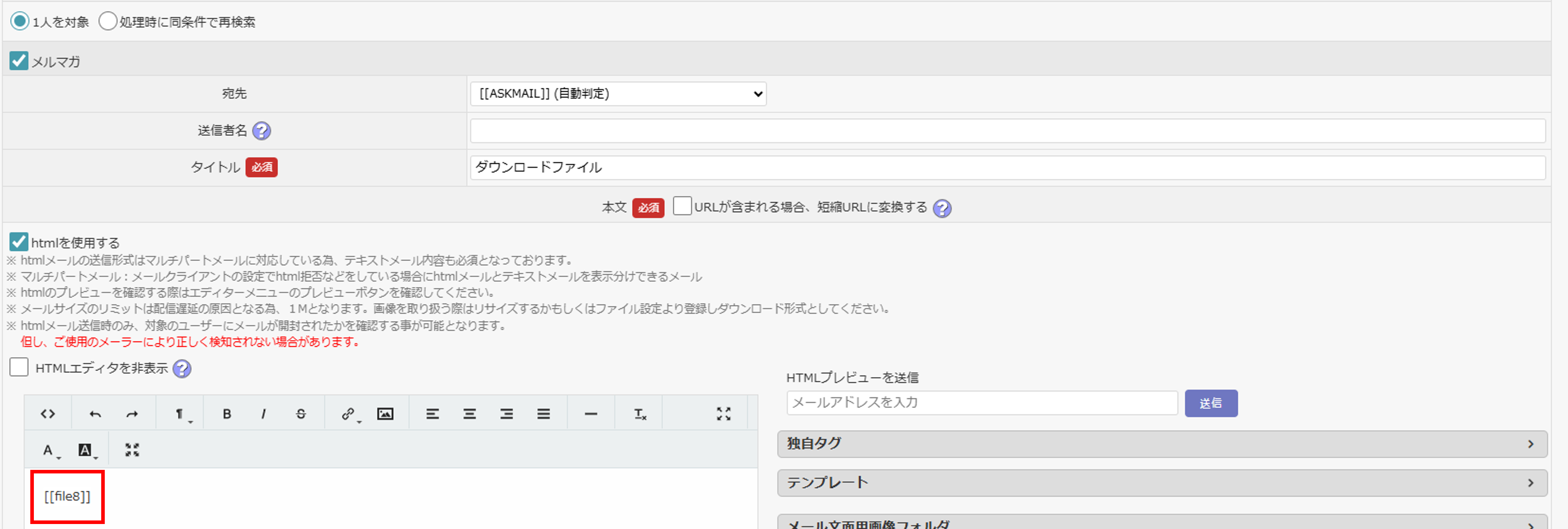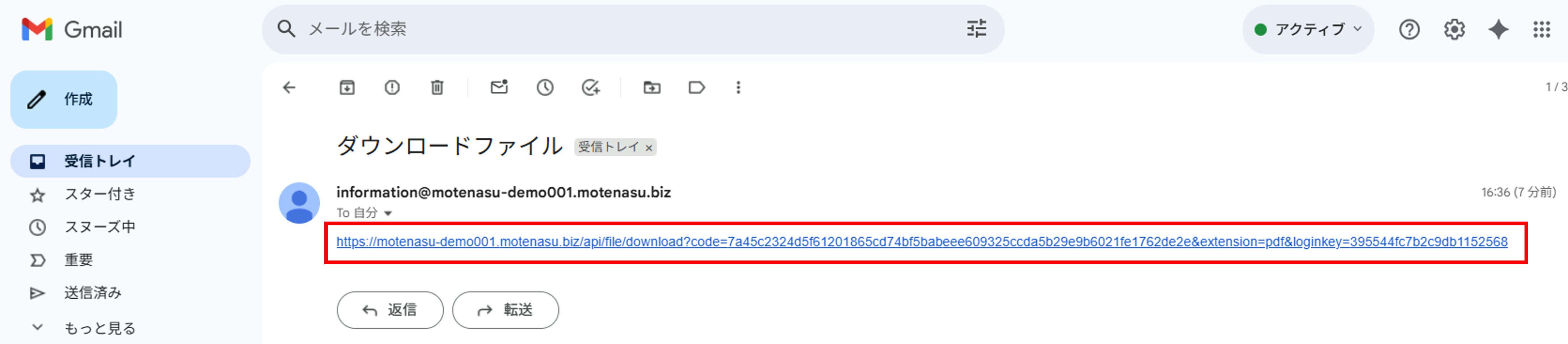 コピーしたタグをメルマガ文中などに貼り付けて配信を行うと、お客様にはファイルのダウンロードURLが表示されます。