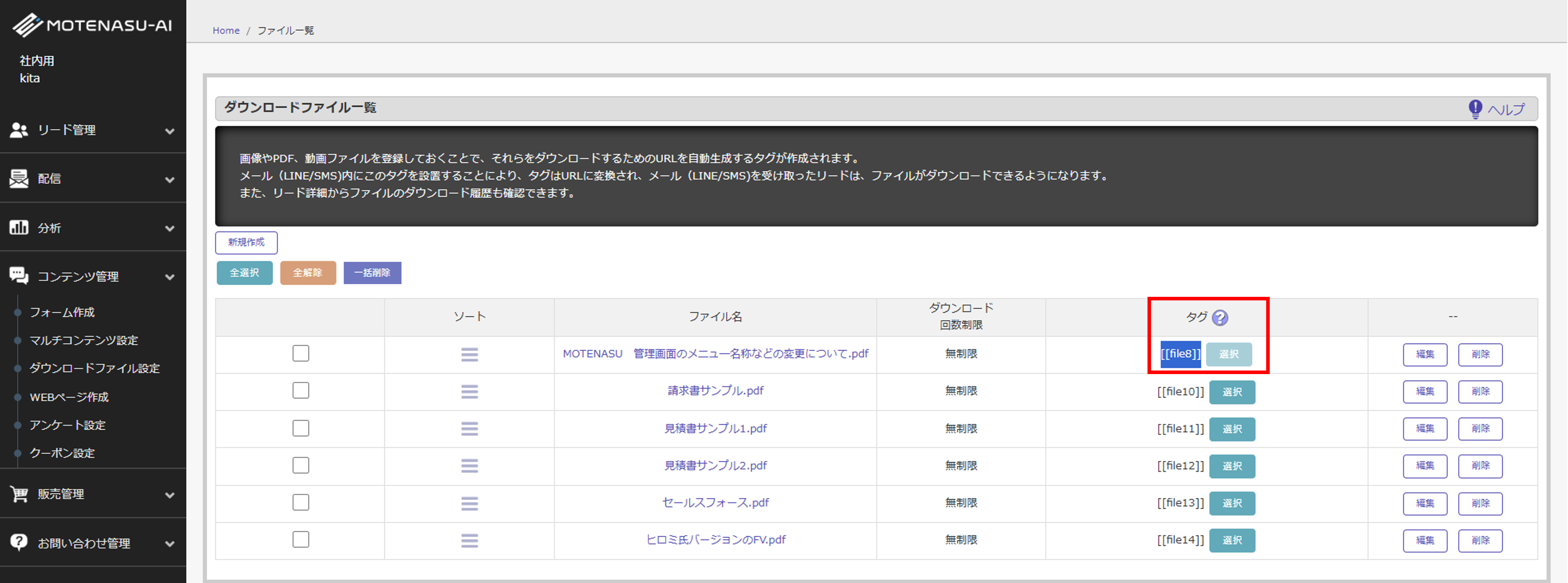 ダウンロードファイル一覧ページで、ファイル行の[選択]ボタンをクリックするとタグ部分が選択状態になるので、コピーをしてください。
