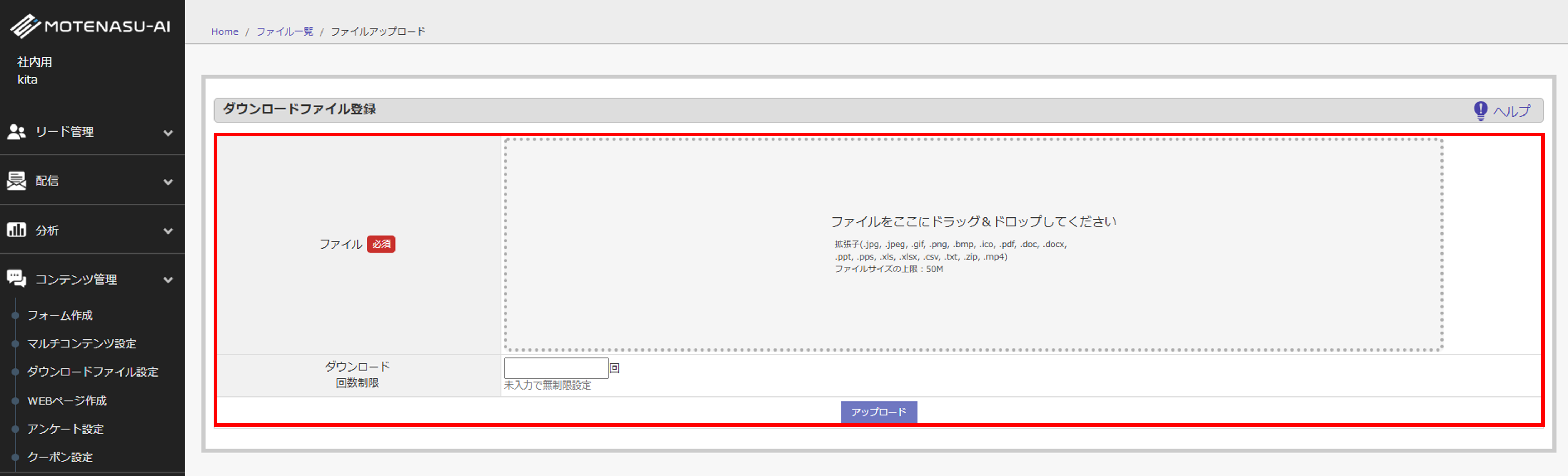 ダウンロード登録画面に遷移します。アップロードするファイルをドラッグ&ドロップし[アップロード]ボタンをクリックすると一覧に追加されます。