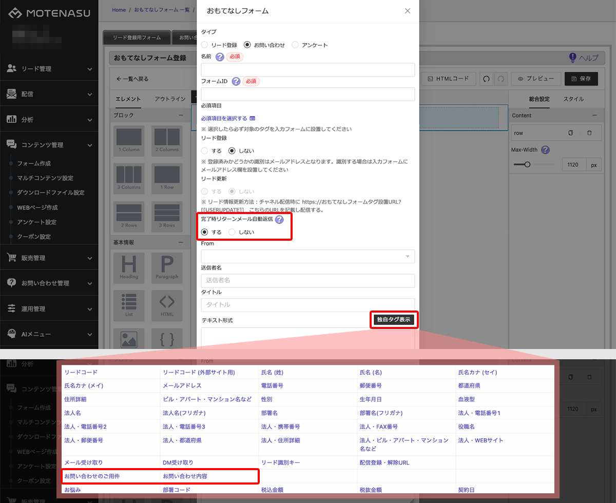 フォーム作成時に、完了時リターンメール自動返信を「する」にし、メール本文に「独自タグ」の「お問い合わせのご用件([[PURPOSE]])」「お問い合わせ内容([[BODY]])」などの変数を入れておくと、登録完了時転送アドレスに登録してあるアドレス宛に自動返信の内容が転送され、内容を確認することができます。