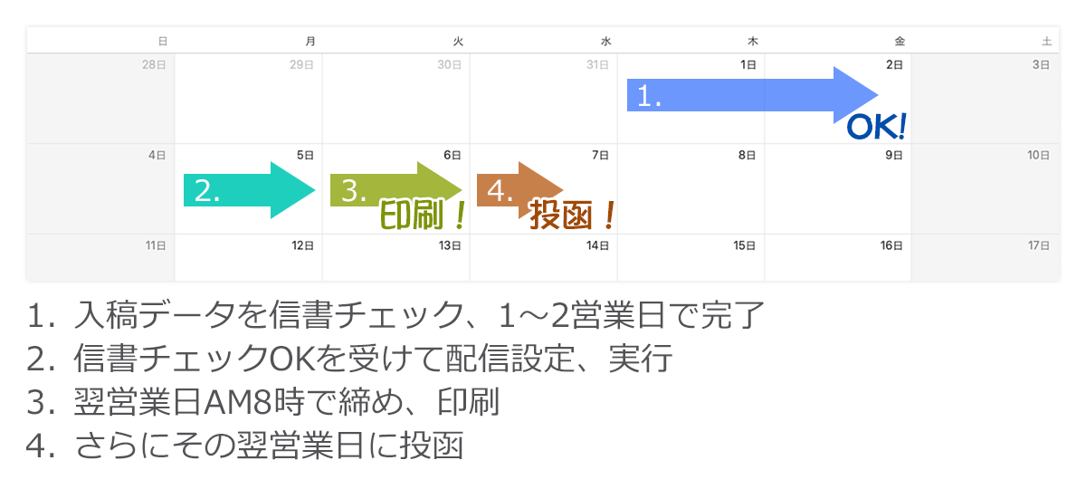 ただし、信書に該当する表現などで文面の修正が生じた場合、その工数と再チェックの時間が必要になります。