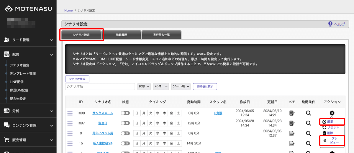 配信 > シナリオ設定 > 一覧のアクション > 編集 > フローチャート画面でプレビュー