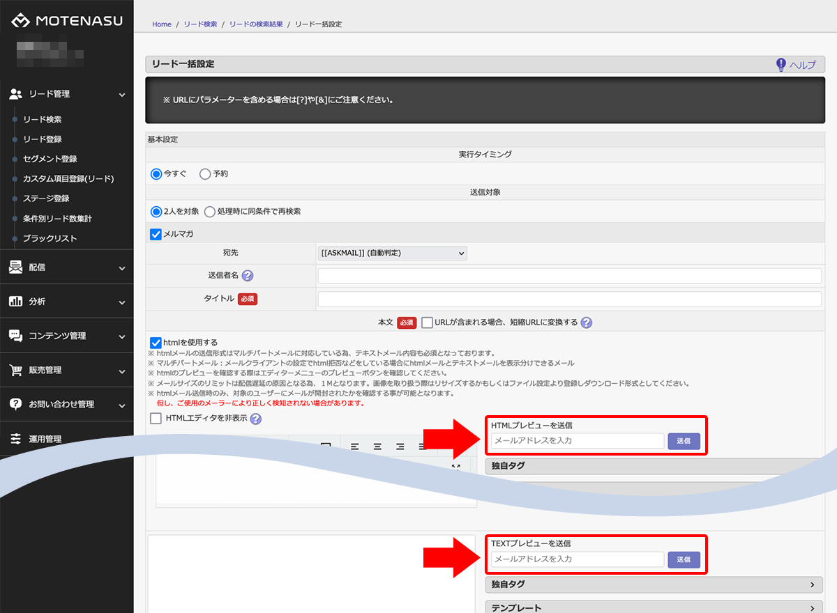 配信 > シナリオ設定 > 一覧のアクション > プレビュー配信対象のリードコードを入力し、[発動]ボタンをクリックします。