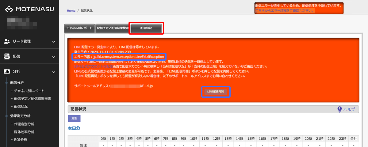- LINE配信を行うと「LINE配信エラー発生中により、LINE配信は停止しています。」という表示がされました。どうしたらいいですか?